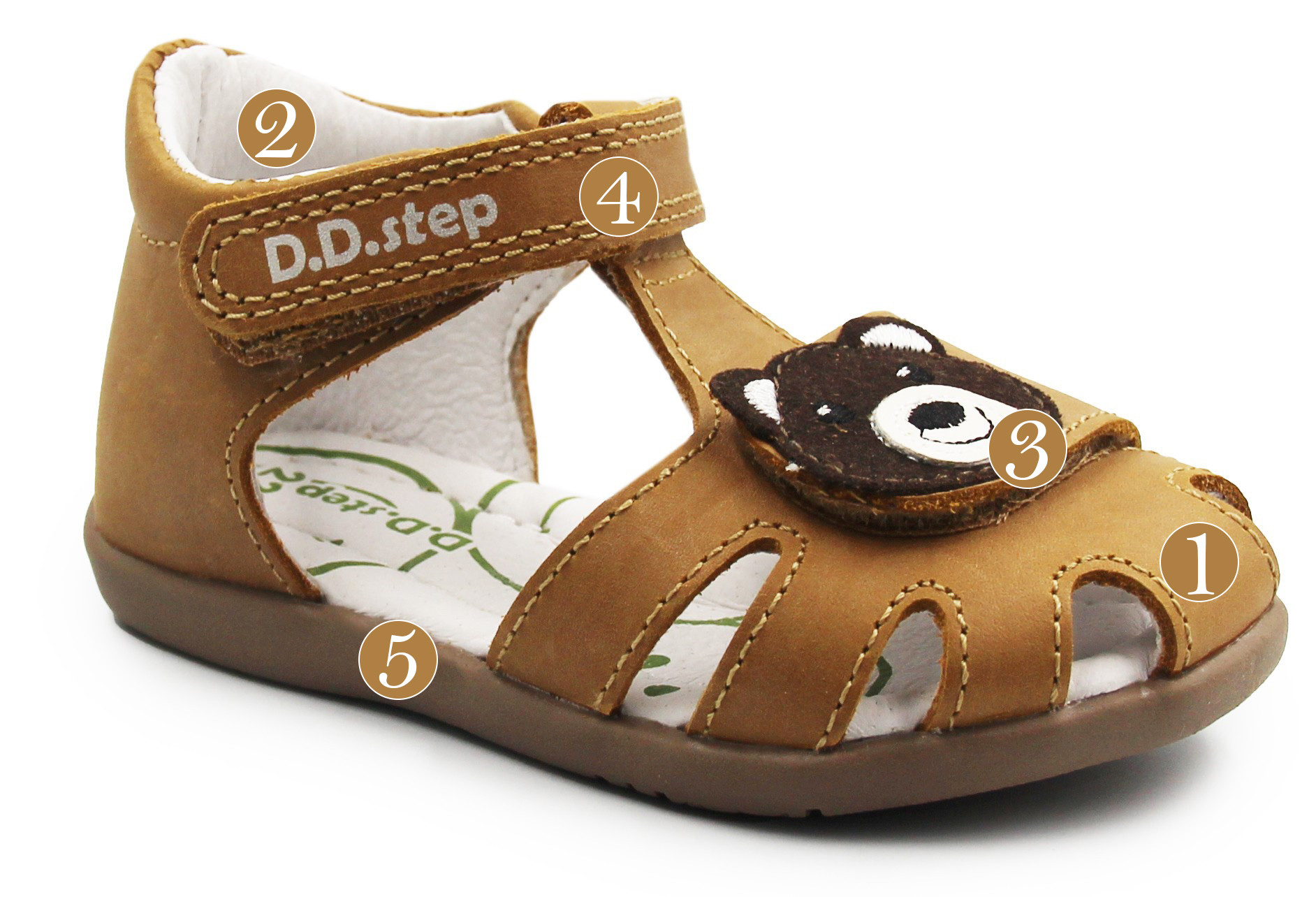 Sandałki dziecięce z uroczym misiem. Wykonane z wysokiej jakości skóry naturalnej, która pozwala skórze oddychać. Podeszwa posiada właściwości amortyzujące wstrząsy podłoża na jakie narażona jest stopa podczas chodzenia. System zapinania na rzepy umożliwia proste i szybkie dostosowanie obuwia do stopy dziecka.
