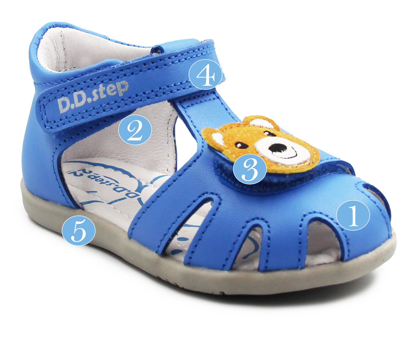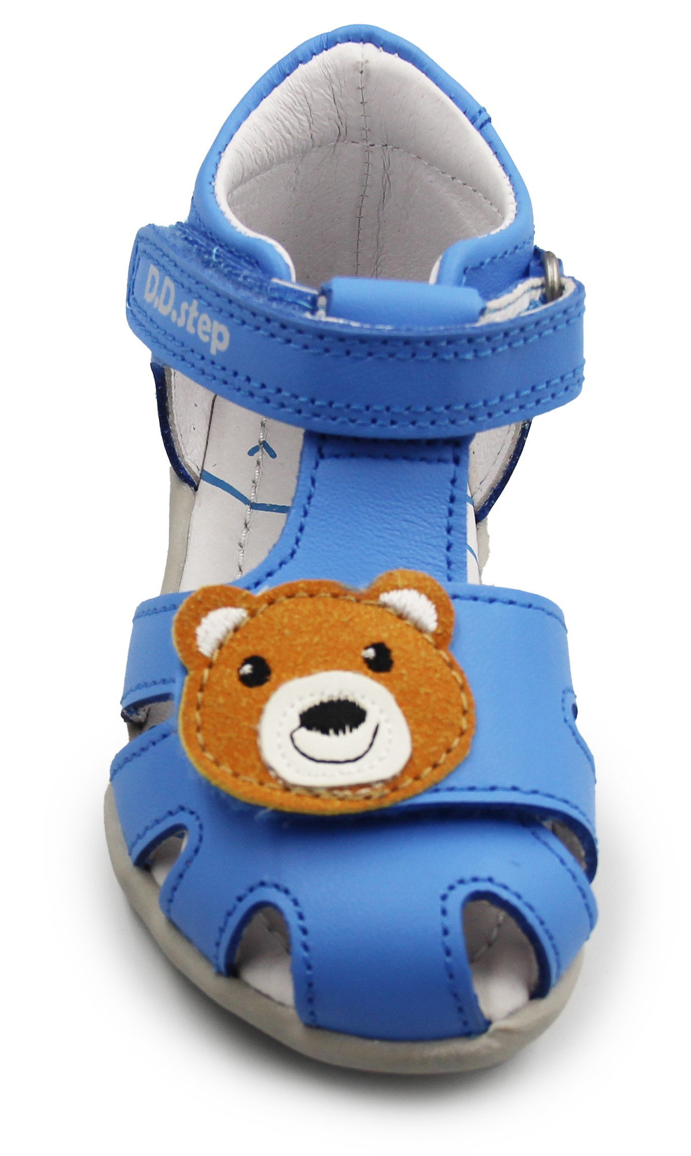 Niebieskie sandałki dziecięce z uroczym misiem. Wykonane z wysokiej jakości skóry naturalnej, która pozwala skórze oddychać. Podeszwa posiada właściwości amortyzujące wstrząsy podłoża na jakie narażona jest stopa podczas chodzenia. System zapinania na rzepy umożliwia proste i szybkie dostosowanie obuwia do stopy dziecka.