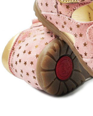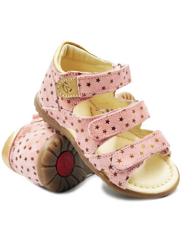 Sandałki z zabudowanymi piętami. Posiadają ozdobny elementy w postaci gwiazdek, co dodaje im dodatkowego uroku. Zapinane za pomocą praktycznych rzepów, które są szybkie w stosowaniu i umożliwiają dopasowanie do indywidualnych potrzeb stopy. Podeszwa ORTHO LINE, wspiera prawidłowe podparcie dla stopy dziecka już od pierwszych kroków.