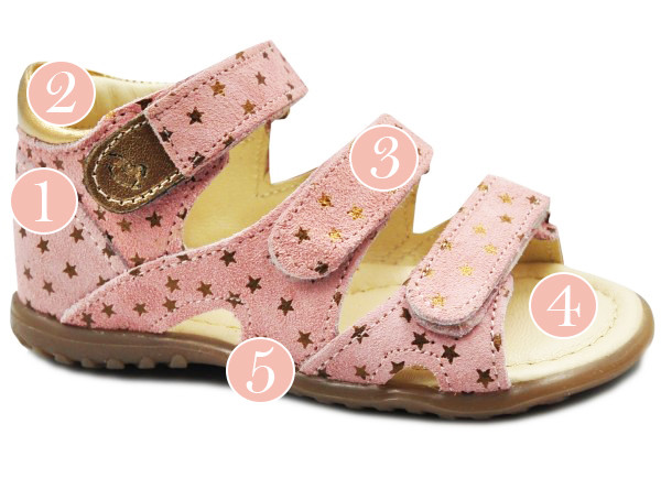 Sandałki z zabudowanymi piętami. Posiadają ozdobny elementy w postaci gwiazdek, co dodaje im dodatkowego uroku. Zapinane za pomocą praktycznych rzepów, które są szybkie w stosowaniu i umożliwiają dopasowanie do indywidualnych potrzeb stopy. Podeszwa ORTHO LINE, wspiera prawidłowe podparcie dla stopy dziecka już od pierwszych kroków.