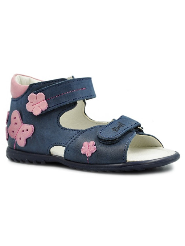 Dziewczęce sandałki firmy Emel e 2207-25w kolorze granatowym z różowym i uroczymi ozdobami.