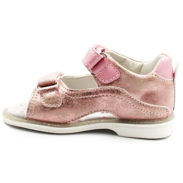 Dziewczęce sandałki w różowej kolorystyce z ozdobnymi biedronkami, które dodają im uroku. Wkładka oraz wnętrze wykonane jest ze skóry. Podeszwa wraz z wkładką posiada dodatkowe elementy ozdobne. Kołnierz wypełniony jest miękką pianką, w celu podwyższenia komfortu podczas użytkowania. Podeszwa została zaprojektowana za pomocą termoplastycznego kauczuku. Zapięcie na rzep jest szybkie, łatwe i praktyczne. Umożliwia dopasowanie obuwia do indywidualnych potrzeb dziecka.