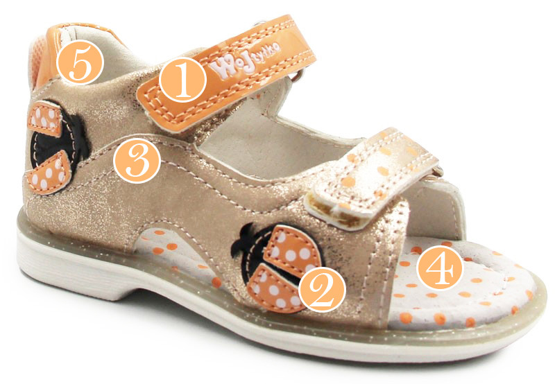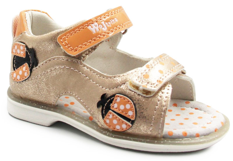Dziewczęce sandałki w różowej kolorystyce z ozdobnymi biedronkami, które dodają im uroku. Wkładka oraz wnętrze wykonane jest ze skóry. Podeszwa wraz z wkładką posiada dodatkowe elementy ozdobne. Kołnierz wypełniony jest miękką pianką, w celu podwyższenia komfortu podczas użytkowania. Podeszwa została zaprojektowana za pomocą termoplastycznego kauczuku. Zapięcie na rzep jest szybkie, łatwe i praktyczne. Umożliwia dopasowanie obuwia do indywidualnych potrzeb dziecka.