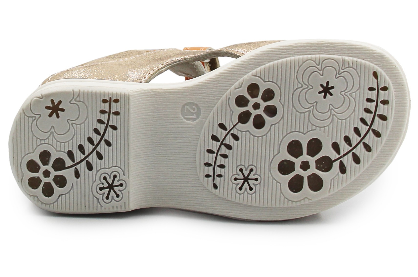 TR - rodzaj podeszwy, który łączy w sobie właściwości gumy oraz tworzyw termoplastycznych. Jest elastyczna, co zapewnia komfort chodzenia i dobre dopasowanie do ruchów stopy. Spód posiada ozdobne elementy kwiatów.