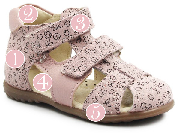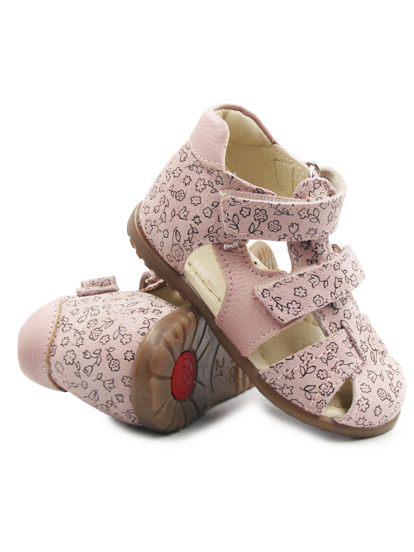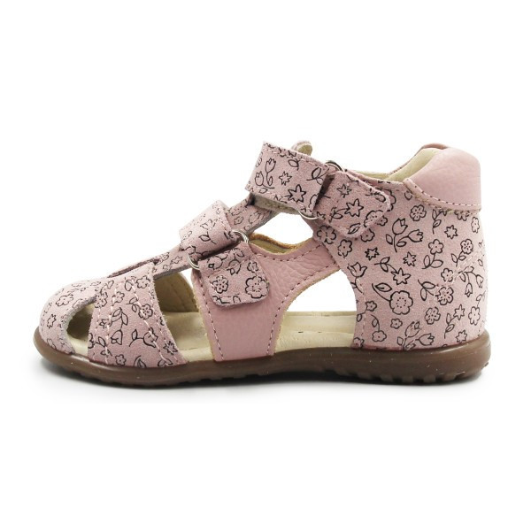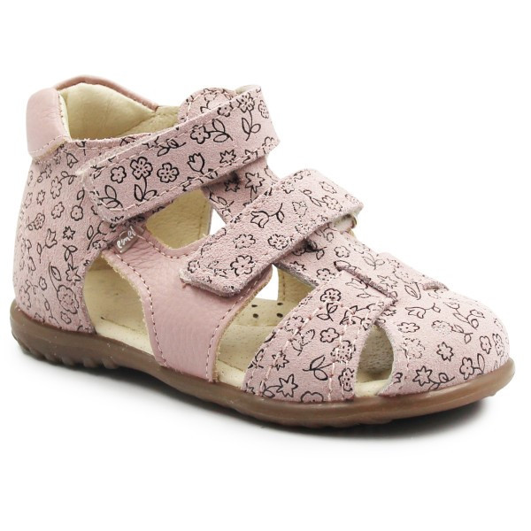 Sandałki z zabudowanymi palcami. Posiadają ozdobny elementy, co dodaje im dodatkowego uroku. Zapinane za pomocą praktycznego rzepu, który jest szybki w stosowaniu i umożliwia dopasowanie do indywidualnych potrzeb stopy. Podeszwa ORTHO LINE, wspiera prawidłowe podparcie dla stopy dziecka już od pierwszych kroków.