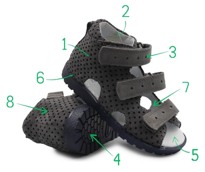 1. Wysoki i usztywniony zapiętek: stabilizuje staw skokowy, pomaga utrzymać prawidłowe ustawienie pięty