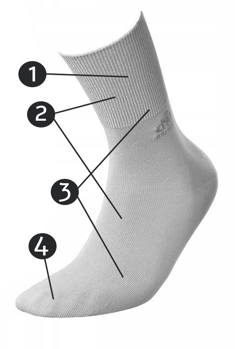 Bezuciskowy ściągacz – skarpety nie powodują ucisku, dzięki czemu są odpowiednie dla osób z wrażliwym układem krążenia, cukrzycą czy obrzękami nóg.