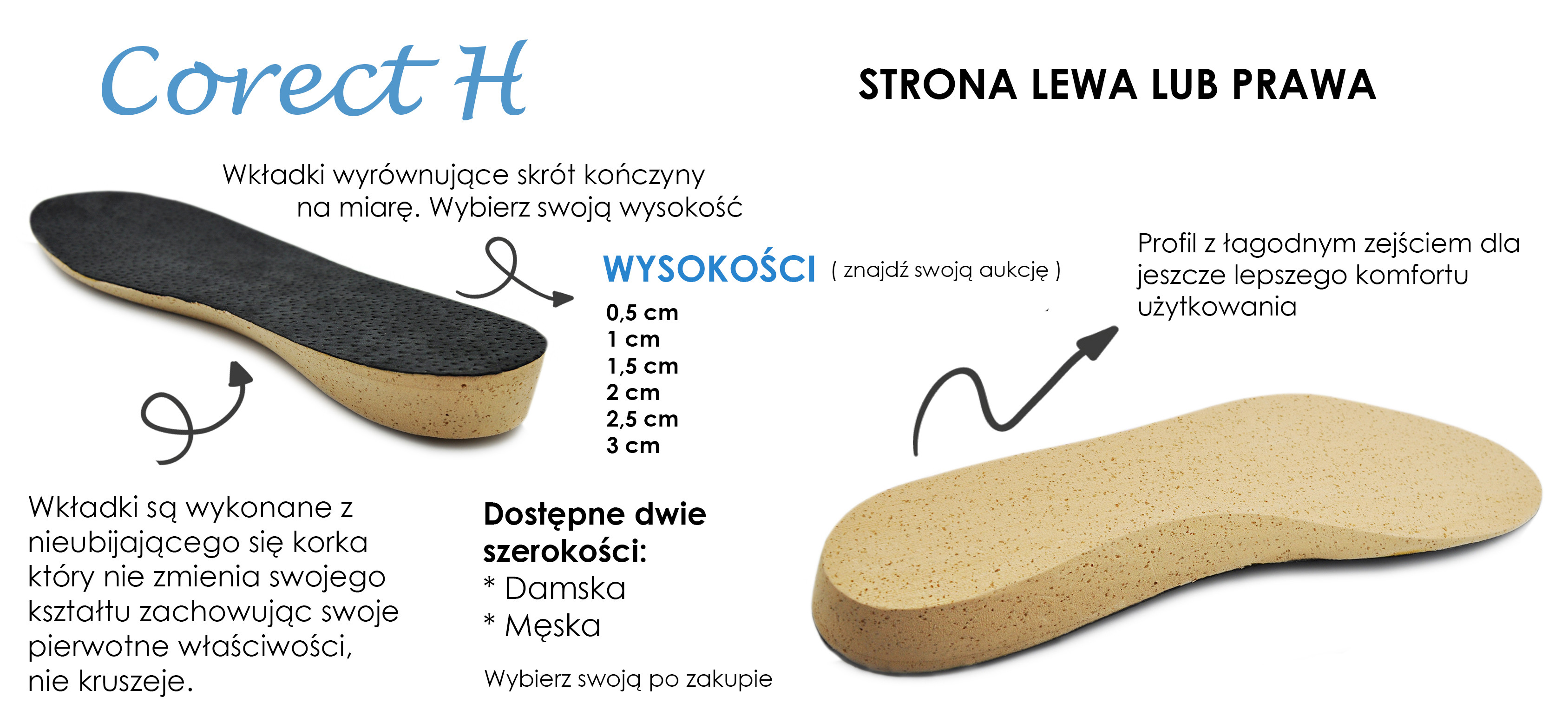 Wkładki ortopedyczne CORECT H wykonywane indywidualnie dostępne są w wysokości od 0,2 cm do 4 cm. Istnieje możliwości zamówienia wkładki wyrównującej skrót całościowej jak i o innej wysokości, niż standardowej (jak powyżej).