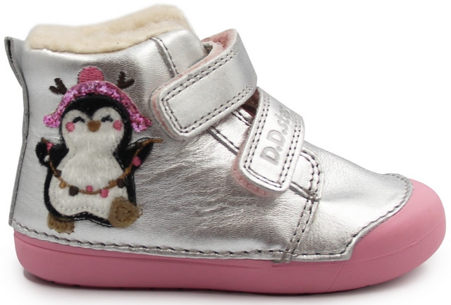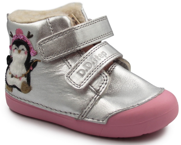 Ocieplane buty dla dziewczynki, wykonane w ciekawej kolorystyce z ozdobnym elementem pingwinka. Ocieplane wnętrze ogrzewa stopy dziecka podczas niższym temperatur. Wykonane z miękkiej skóry naturalnej. Wyposażone w właściwości hydrofobowe.