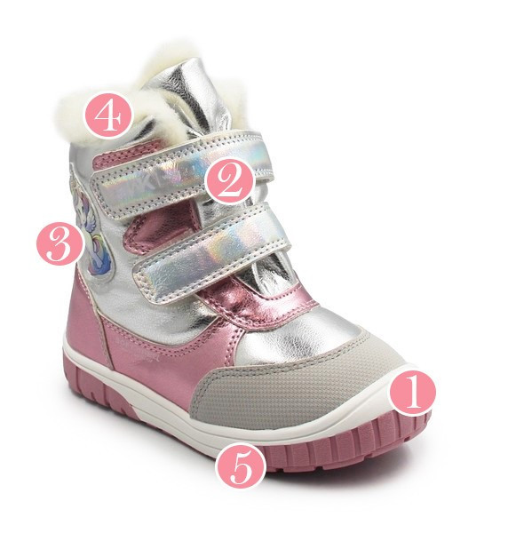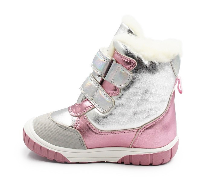 Dziewczęce buty zimowe, ich wnętrze pokryte jest miękkim futerkiem, które zapobiega odczuwaniu zimnych temperatur. Zapinane za pomocą dwóch rzepów. Antypoślizgowa tekstura na spodzie buta to dodatkowa przyczepność do podłoża.