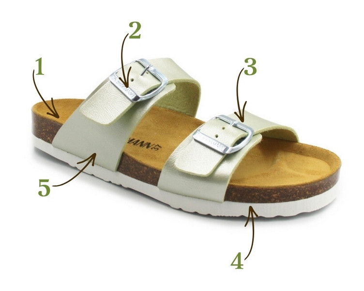 1. Wkładka - wykonana ze skóry naturalnej, osadzona na korkowo - lateksowej bazie. Posiada profilowaną konstrukcję, która dopasowuje się do kształtu stopy w trakcie użytkowania.