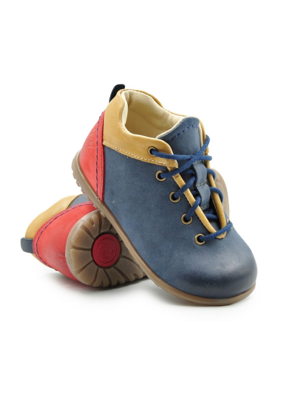 Trzewiki Emel e 2413-18 to profilaktyczne buty przeznaczone dla dzieci które zaczynają swoją przygodę z chodzeniem. Kolor granatowy z żółtymi i czerwonymi wstawkami spodoba się każdemu chłopcu.