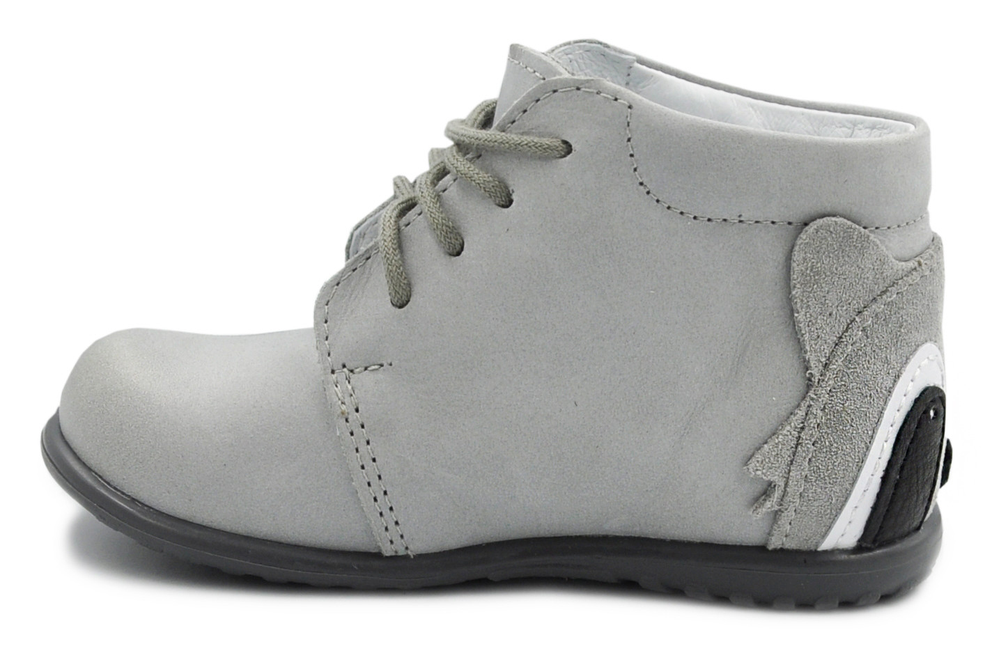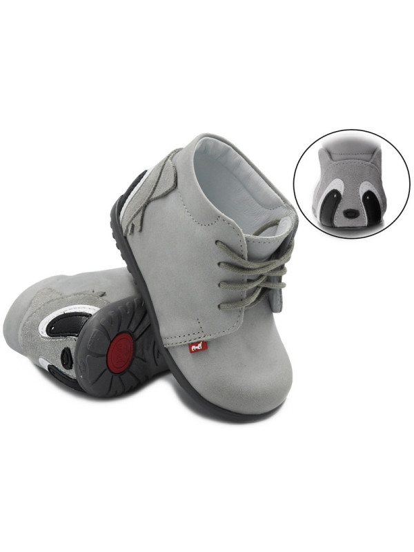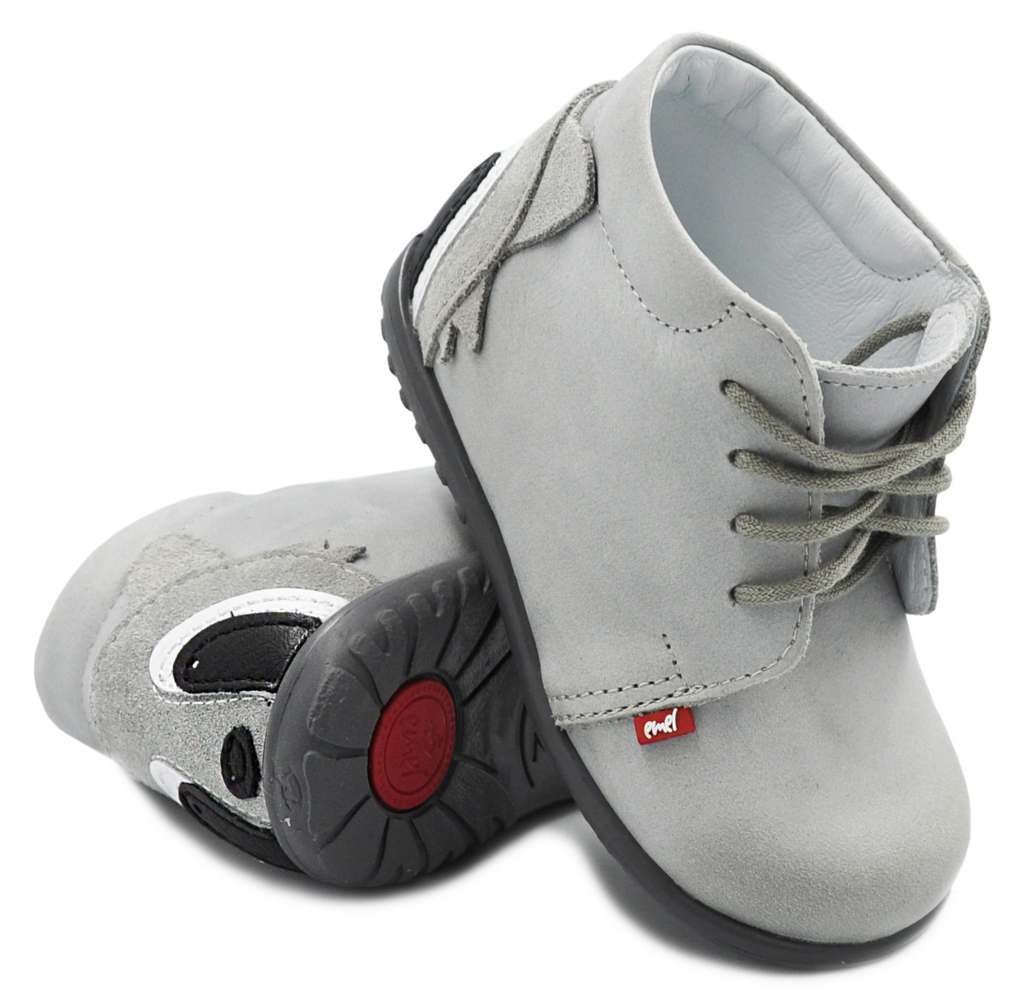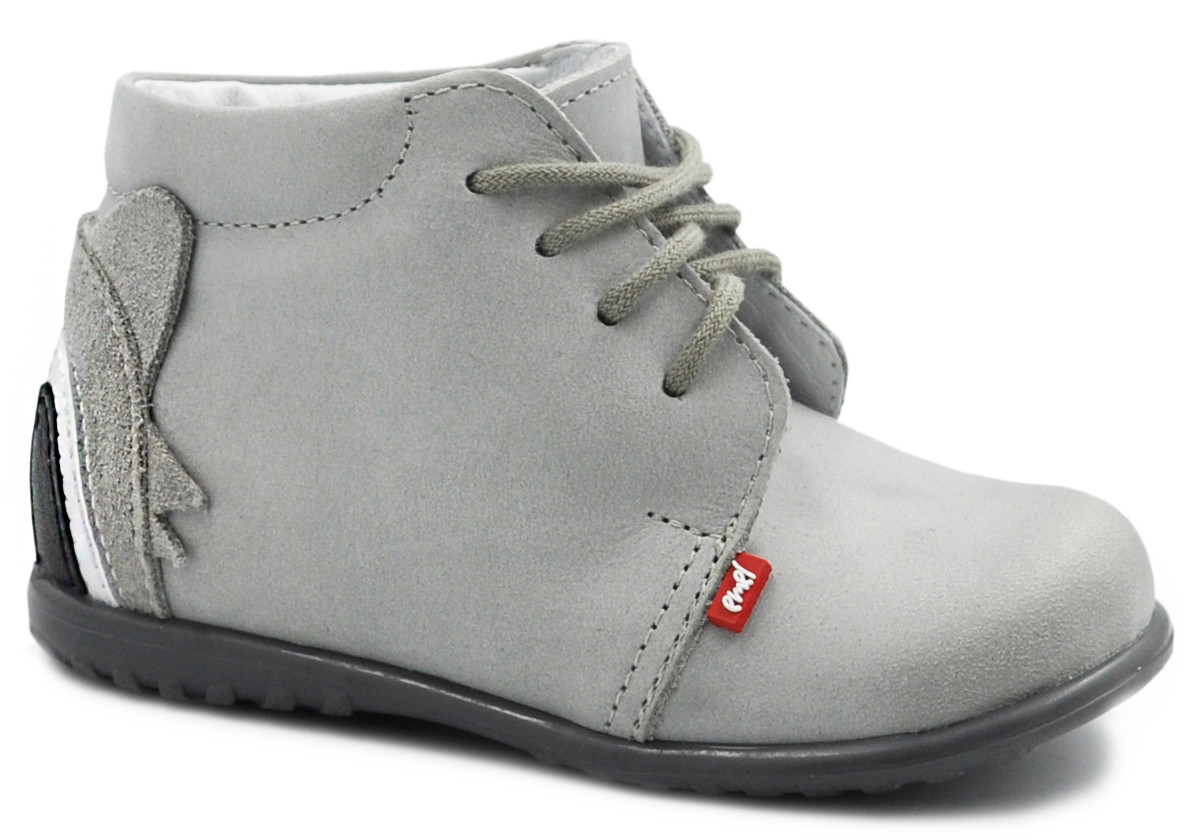 Szare trzewiki Emel e 1150 to ręcznie wykonane obuwie profilaktyczne stworzone z myślą o najmłodszych, którzy stawiają pierwsze kroki. Wykonane z wysokiej jakości naturalnej skóry nubukowej wolnej od chromu, zapewniają idealne dopasowanie, komfort i bezpieczeństwo dla delikatnych dziecięcych stóp. Uroczy motyw pandy z tyłu buta sprawia, że model ten zachwyca nie tylko jakością, ale i wyglądem.
