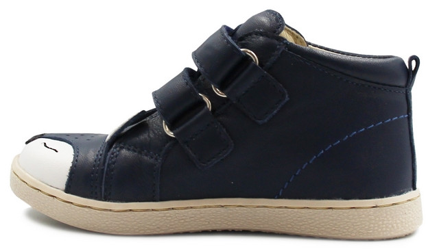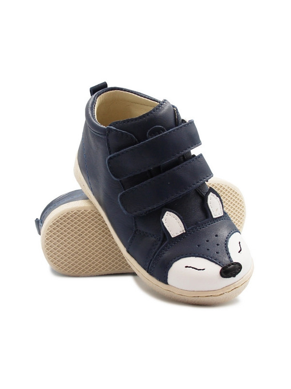 Przód bucików zdobią słodkie pyszczki lisków. Buty wykonane są z wysoko jakościowej skóry naturalnej, w kolorze granatowym, co zapewnia cyrkulację powietrza, stopy nie będą się w nich nadmiernie pocić i wydzielać nieprzyjemnego zapachu. Górna część cholewki została wykończona kołnierzem wypełnionym pianką, który eliminuje ewentualne uciski i zapobiega otarciom.