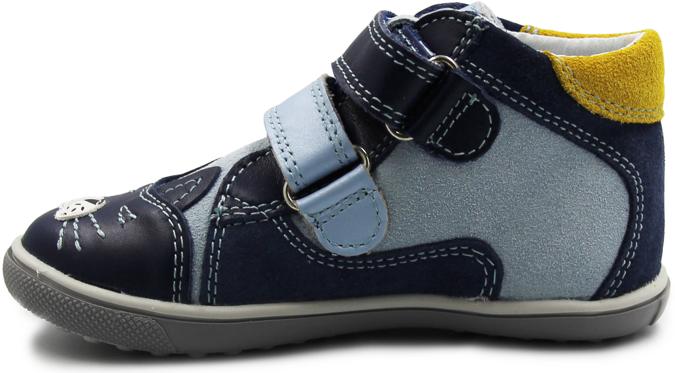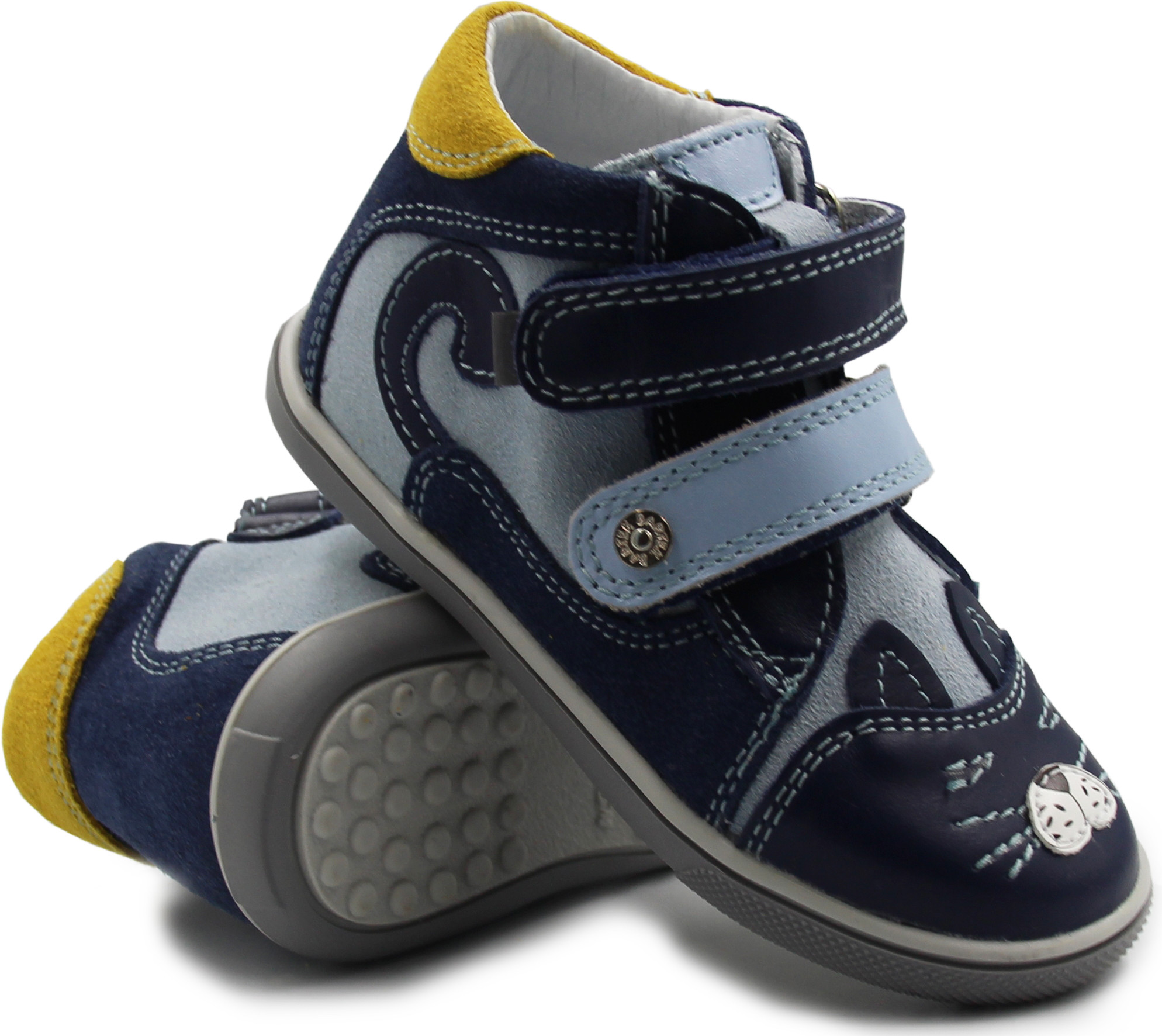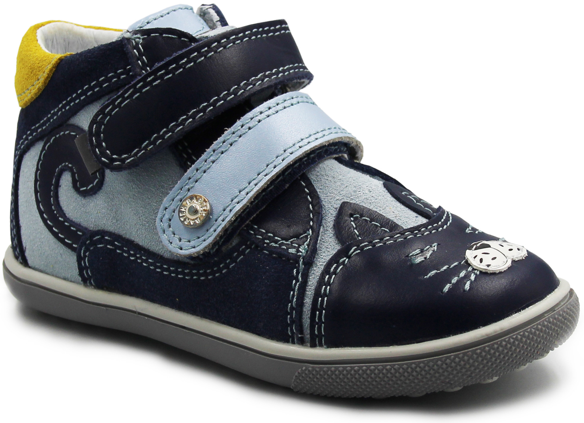 Chłopięce trzewiki firmy Bartek w kolorze granatowo - niebieskim z aplikacją kotka.