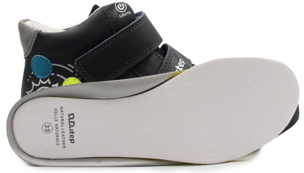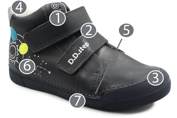 Buty posiadają światełka Led, które włączają się przy użyciu przycisku. Zapinane na rzep, umożliwiają dopasowanie do szerokości stopy. Wkładka wykonana jest ze skóry naturalnej oraz posiada możliwość wyjmowania. Zapiętek obuwia jest miękki co sprzyja poprawie komfortu podczas chodzenia.