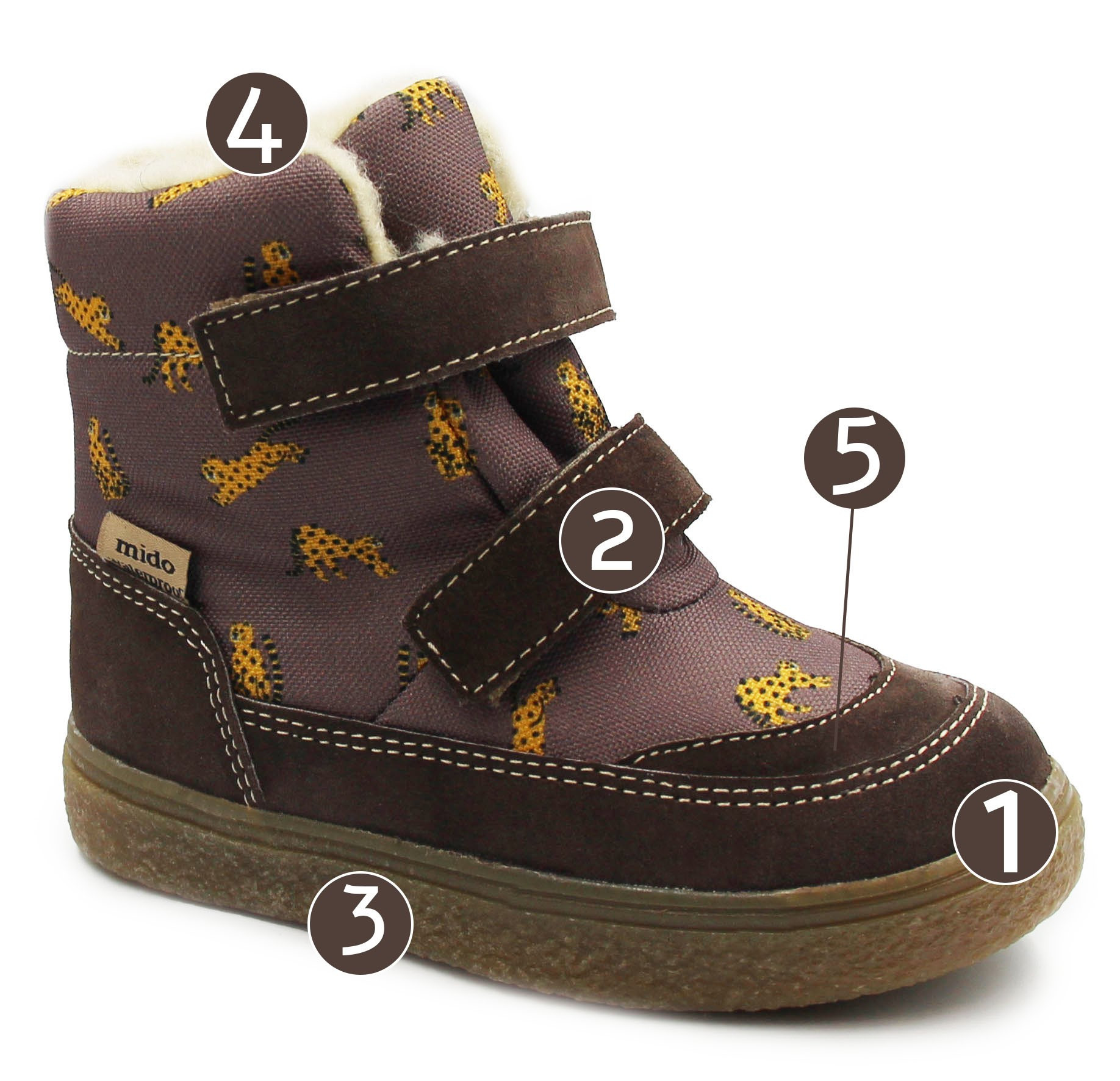 Ciepłe i wodoodporne buciki zimowe dla dzieci, wykonane z połączenia miękkiej skóry welurowej i wytrzymałego materiału tekstylnego. Wnętrze wyłożone ciepłą wełną oraz dodatkowo zabezpieczone membraną, która chroni przed wilgocią. Elastyczna podeszwa i usztywniona pięta dbają o komfort podczas użytkowania. Zapinane za pomocą dwóch praktycznych rzepów.