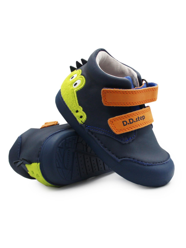 Urocze trzewiki D.D.step z niebieskim krokodylkiem są idealne dla maluchów, które stawiają pierwsze kroki. Wykonane w całości ze skóry, wyposażone w skórzaną, wyjmowaną wkładkę, zapewniają komfort i wsparcie. Dzięki regulacji na rzepy, łatwo je dopasować do stopy dziecka, a hydrofobowa i antypoślizgowa podeszwa z naturalnego kauczuku chroni przed wilgocią i zapobiegają poślizgnięciu się.