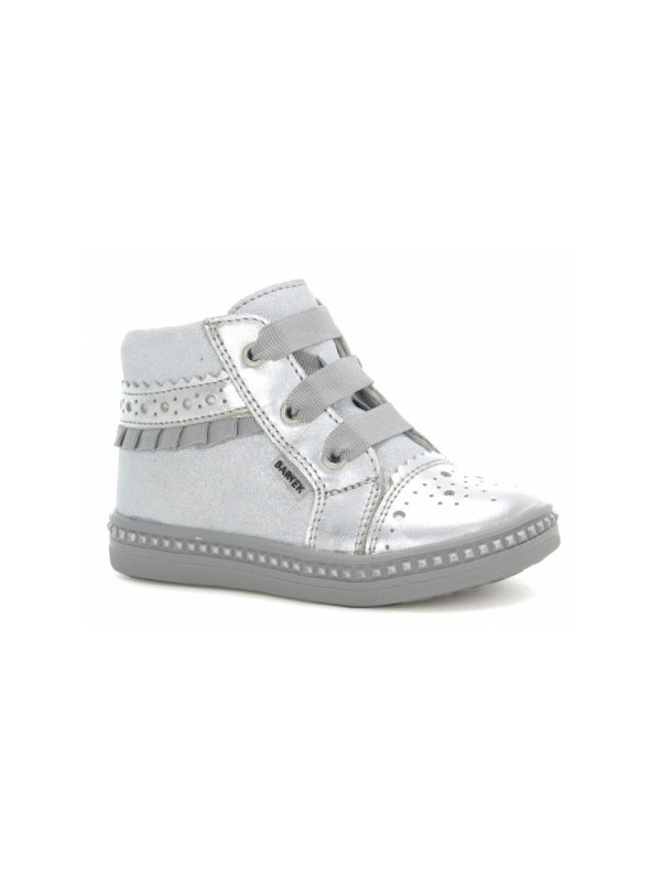 Dziewczęce trzewiki firmy Bartek w kolorze szaro-srebrnym z uroczą falbaną.