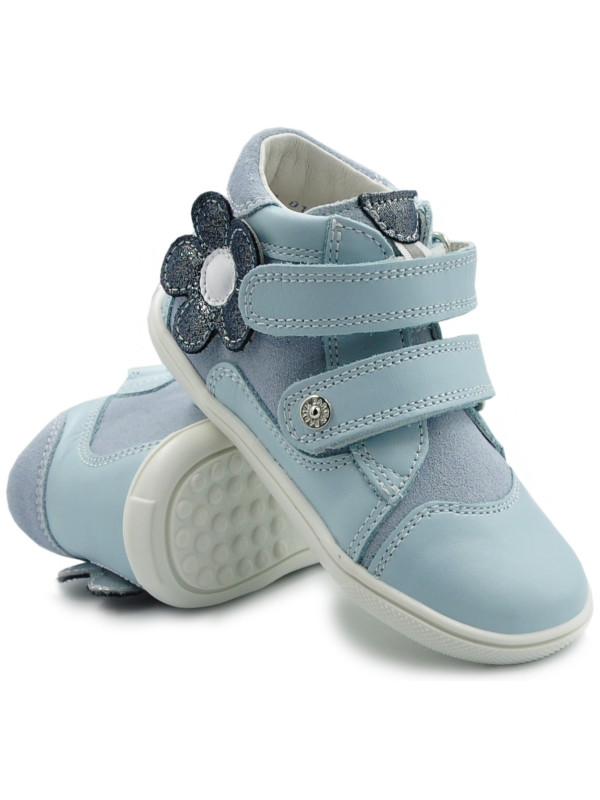 Dziewczęce sportowe trzewiki firmy Bartek w kolorze błękitnym z kwiatuszkiem.