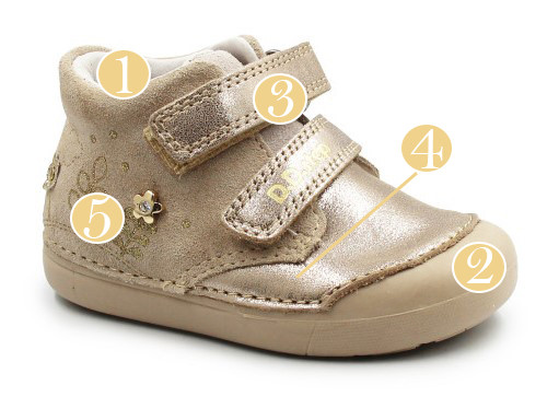 Zarówno z zewnątrz, jak i w środku, wykonane są z miękkiej skóry, co zapewnia komfort i odpowiednią wentylację dla stóp. Ich elastyczna, miękka podeszwa zapewnia swobodę ruchów. Miękki zapiętek delikatnie stabilizuje stopę, jednocześnie pozostawiając dużo miejsca na palce. Zapinane za pomocą dwóch rzepów, co jest praktyczne oraz szybkie, a dodatkowo umożliwia dziecku samodzielne zakładanie.
