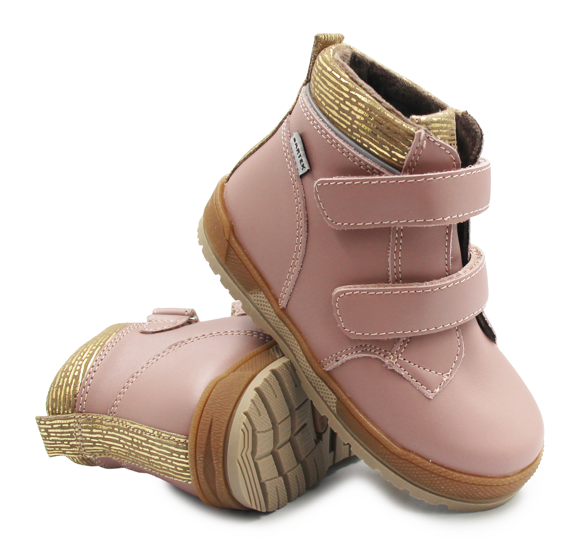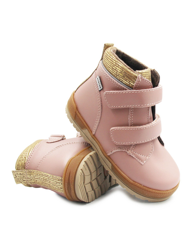Różowe trzewiki z subtelnymi złotymi elementami prezentują się modnie i dziewczęco. Buty posiadają praktyczne zapięcie na dwa rzepy, które pozwala dziecku samodzielnie je zakładać i zdejmować. Dzięki temu dopasowanie do stopy jest szybkie i wygodne, a maluch może cieszyć się swobodą w każdej sytuacji.
