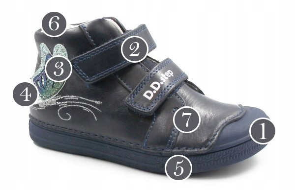 Wykonane z wysokiej jakości skóry naturalnej, posiadają wyjmowaną, skórzaną wkładkę, która gwarantuje doskonałe dopasowanie. Dzięki praktycznym rzepom, zakładanie jest szybkie i łatwe, a szerokość buta można precyzyjnie dopasować do stopy. Podeszwa z naturalnego kauczuku jest odporna na uderzenia, ale także zapewnia świetną przyczepność. Buty są przy tym lekkie i elastyczne, wspierając naturalny sposób poruszania się. Buty wyróżniają się aplikacją z motywem motylka z boku.