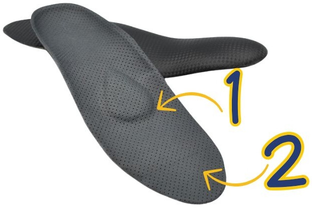 ➡️ Pelota metatarsalna (1) – anatomicznie ukształtowana poduszka umieszczona w środkowej części wkładki ma za zadanie przywrócenie naturalnego łuku poprzecznego stopy. Działa poprzez delikatne podniesienie i podparcie kości śródstopia, poprawiając biomechanikę chodu oraz zmniejszając nacisk na przodostopie. Jest to kluczowy element w korekcji płaskostopia poprzecznego i zapobieganiu dalszym deformacjom.