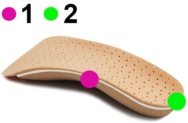Wkładki ortopedyczne Correct LS 3/4 posiadają charakterystyczną budowę, która służy statycznemu podparciu łuku podłużnego (1), z jednoczesnym ustawieniem kości piętowej w korytku, w którym zastosowana jest korekcja supinacji (2)
