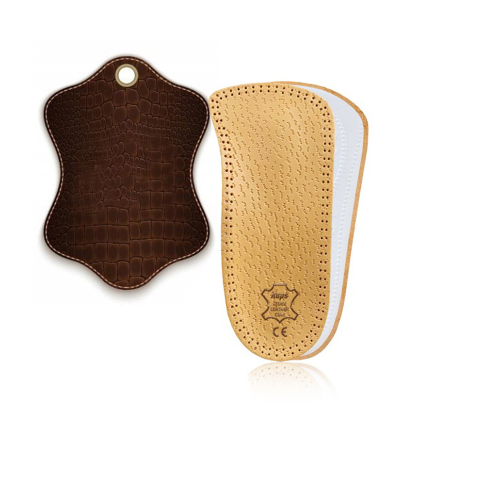 Zastosowane materiały: skóra naturalna łatwo pochłaniająca pot wydzielany przez stopy, tworzywo moosgummi, dwustronna taśma samoprzylepna.