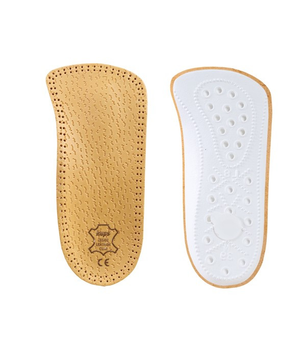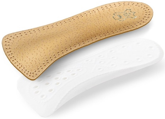 Zastosowane materiały: skóra naturalna łatwo pochłaniająca pot wydzielany przez stopy, tworzywo moosgummi, dwustronna taśma samoprzylepna.